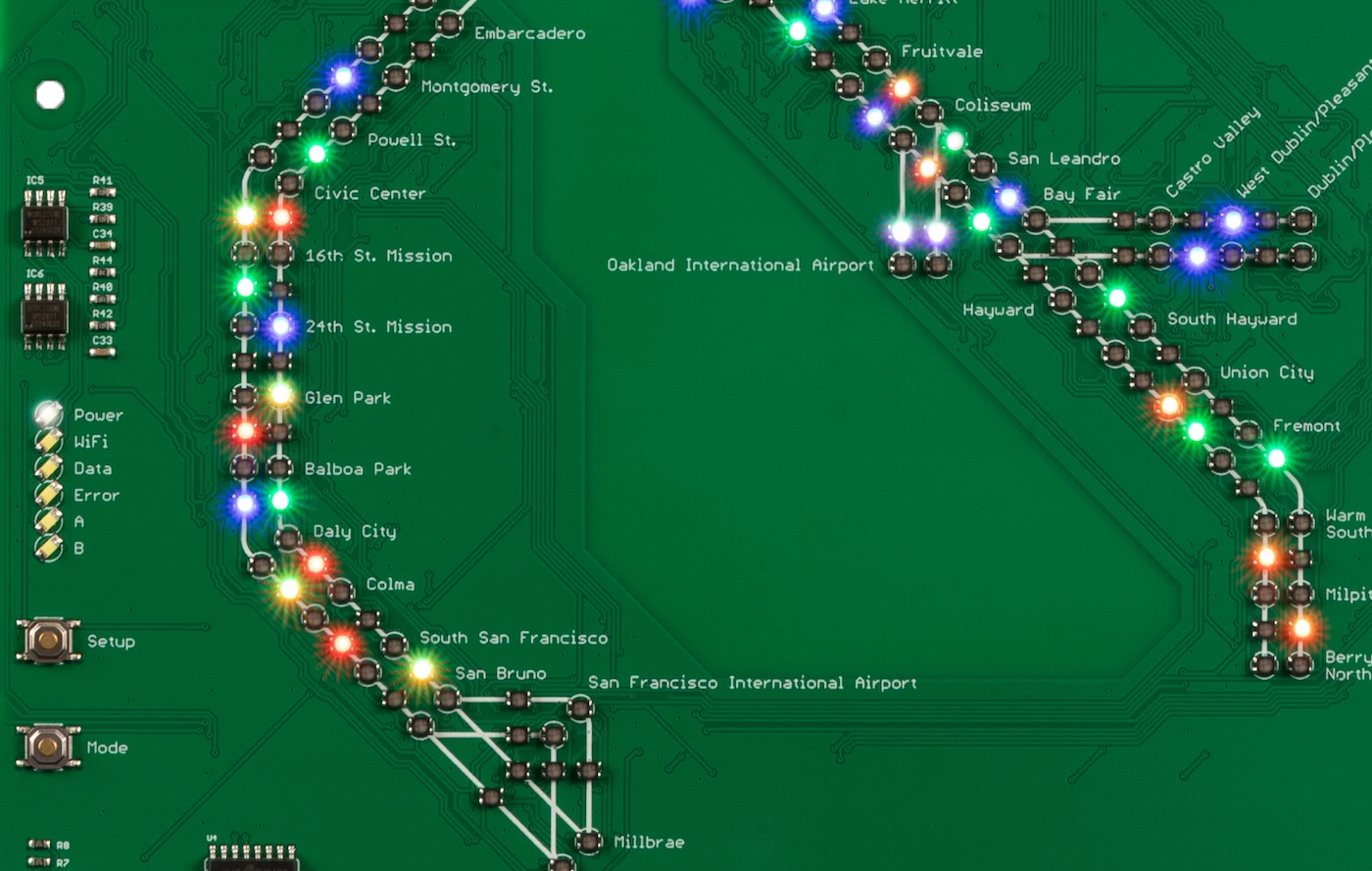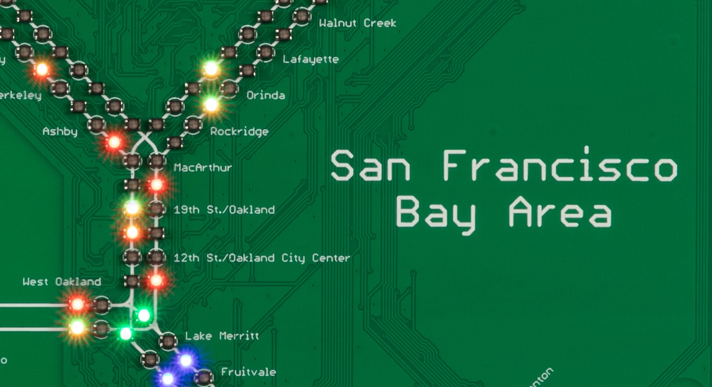 Tracks trains on BART in San Francisco, showing live locations as each vehicle moves around the network.