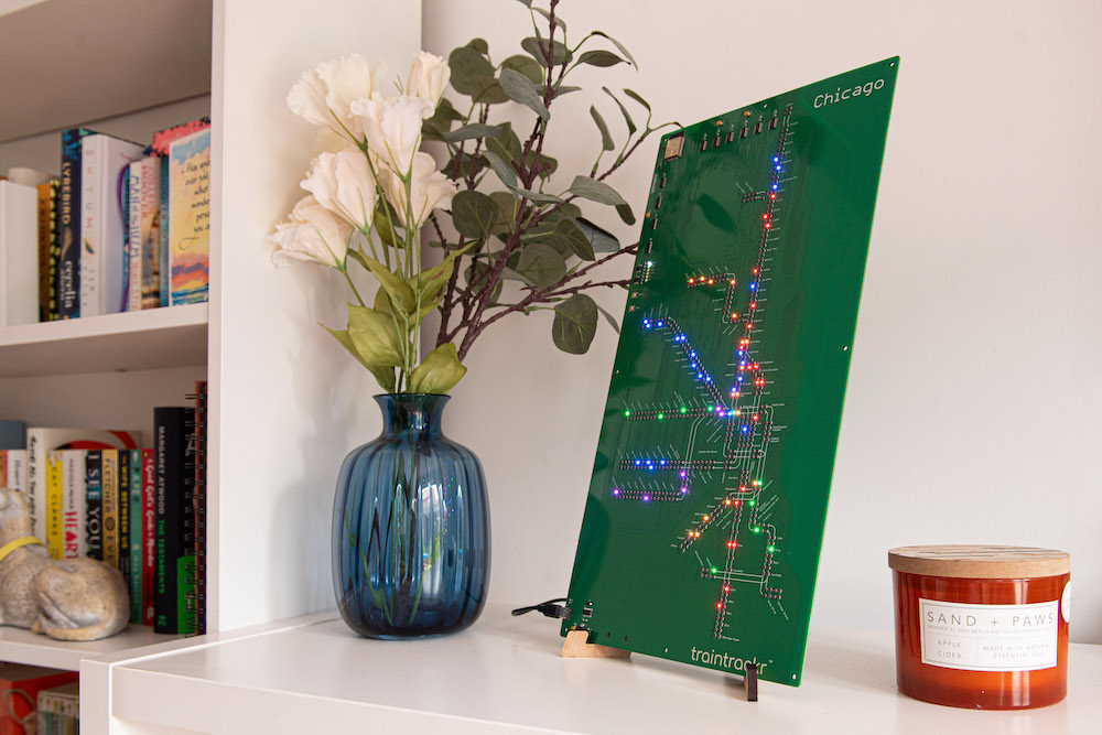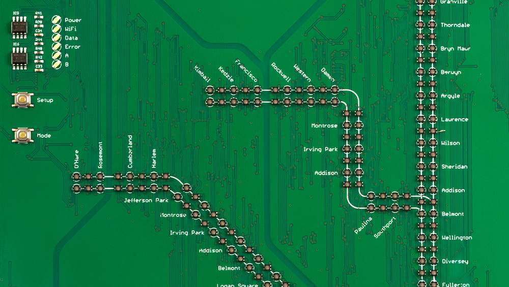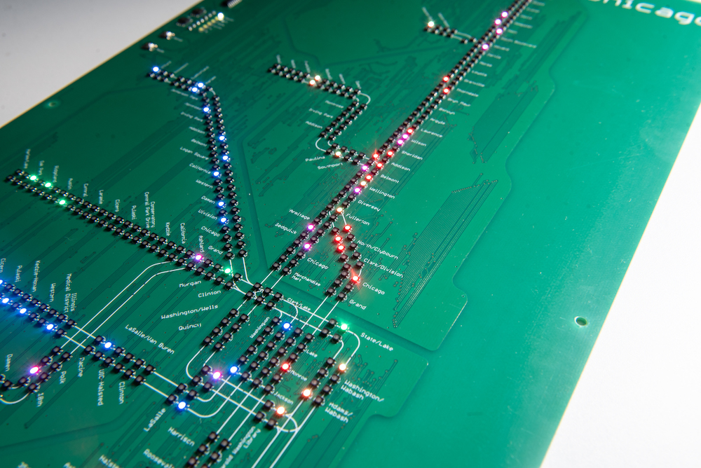This beautiful PCB displays the live bi-directional movement of trains throughout all stations on the Chicago 'L'.